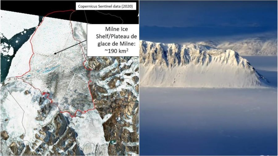 Ľadové polárna čiapka sa, momentálne, topí až šesťkrát rýchlejšie, ako počas roku 1980 a fenomén známy ako polárna amplifikácia spôsobuje enormné roztápanie ľadovcov. „Severné pobrežie kanadského Ellesmere bolo pokryté ľadovcovým štítom, no v dôsledku ľudskej činnosti a otepľovania, taktiež, skolaboval,“ hovorí Adrienne White z Canadian Ice Service, ktorá spozorovala rozlomenie ľadovca na satelitných snímkach. Od roku 2005 bol ľadovcový štít Milne posledným neporušeným v Kanade.