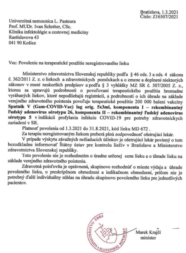 Len včera Minister zdravotníctva Marek Krajčí podpísal použitie vakcíny Sputnik V na boj s ochorením COVID-19 na Slovensku. Nateraz by sa mohla používať do konca augusta. Povolenie na terapeutické použitie zverejnilo na webe Ministerstvo zdravotníctva SR.