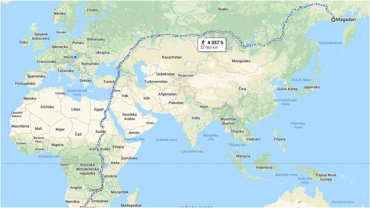 Podľa Google máp to vyzerá, že ak budeš kráčať 187 dní bez prestávky, mal by si v pohode doraziť do cieľa. Je jedno, kde začneš, či v Rusku alebo na juhu Afriky. Čas je stále rovnaký. Do odhadu však nie je započítaný spánok ani iné prestávky na oddych či občerstvenie. Pre upresnenie, ide o 4 357 hodín vytrvalej pešej turistiky.