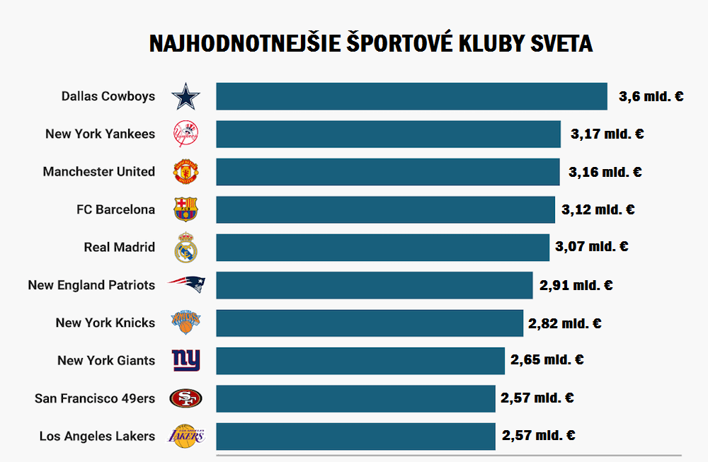 - To, že sa v športe točia obrovské milióny niet žiadnych pochýb. Potvrdzuje nám to najnovší rebríček od Forbes, ktorý zoskupil 50 najhodnotnejších športových klubov, kde sa celkové hodnoty pohybujú v miliardách € a ročné príjmy dosahujú astronomické hodnoty. Zoznam prináša rôzne prekvapenia, ale aj naplnil očakávania.