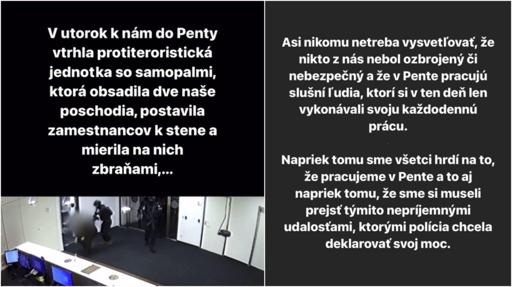 Video zverejnila na Instagrame aj marketingová špecialistka Penty Nicole Nevolníková. „V utorok k nám do Penty vtrhla protiteroristická jednotka so samopalmi, ktorá obsadila dve naše poschodia, postavila zamestnancov k stene a mierila na nich zbraňami,“ komentuje situáciu Nevolníková.