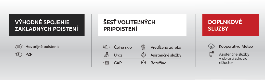 Na jednej zmluve v sebe zahŕňa havarijné poistenie a PZP, množstvo pripoistení pre všetky životné situácie spojené s autom – a dokonca aj praktický bonus v podobe osobnej predpovede počasia Kooperativa Meteo a asistenčných služieb v oblasti starostlivosti o svoje zdravie eDoctor.
