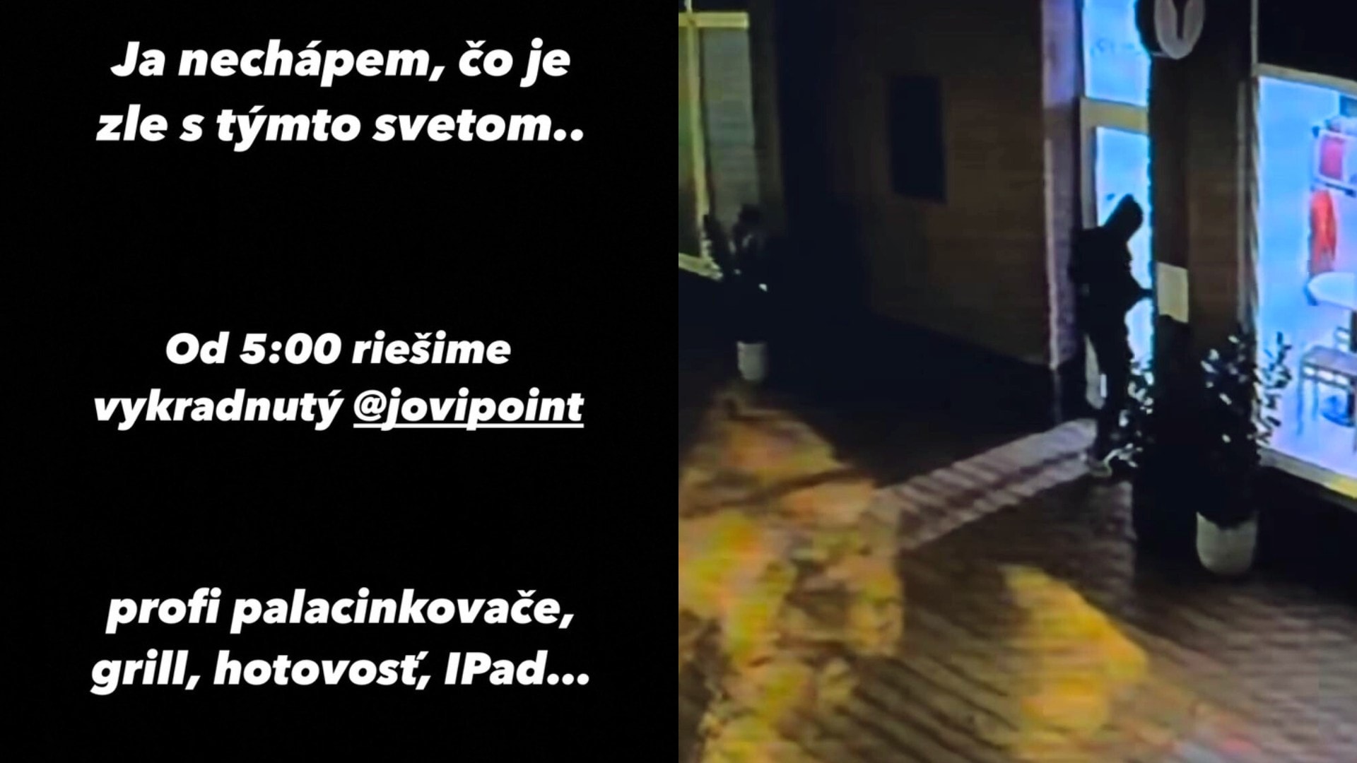 - Jovinečko v pondelok na svojom Instagrame oznámil, že jeho prevádzku vykradli